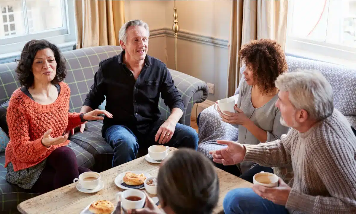 [Image showing a small group of friends in a deep, meaningful conversation at a cafe]